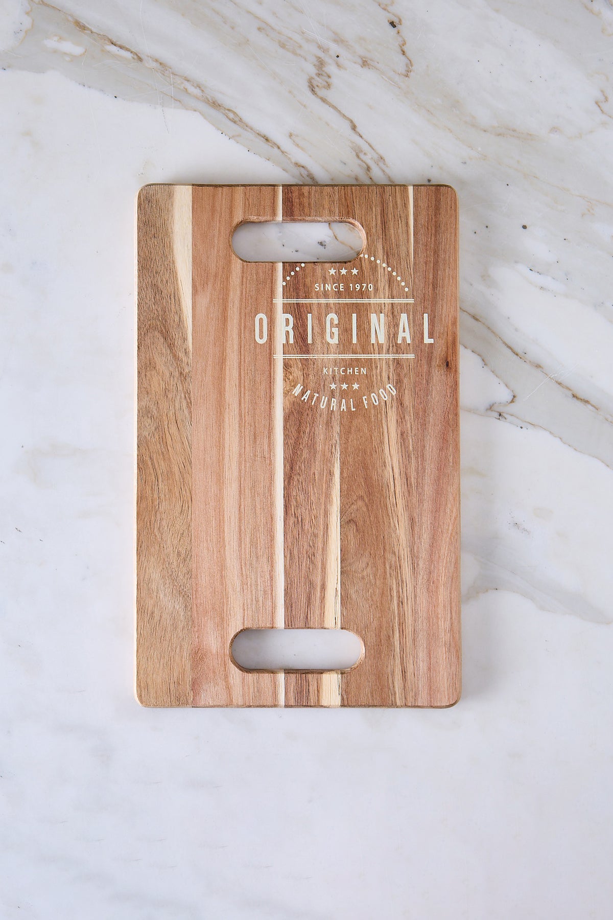 Práctica y robusta, esta tabla de acacia maciza cuenta con dos aberturas laterales para un agarre firme y seguro. Ideal tanto para cortar como para presentar quesos, fiambres o entradas.