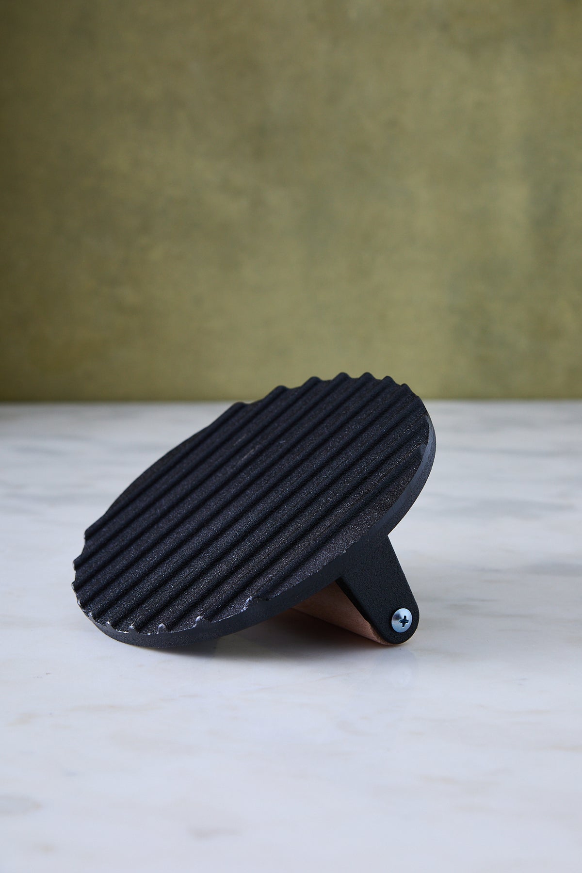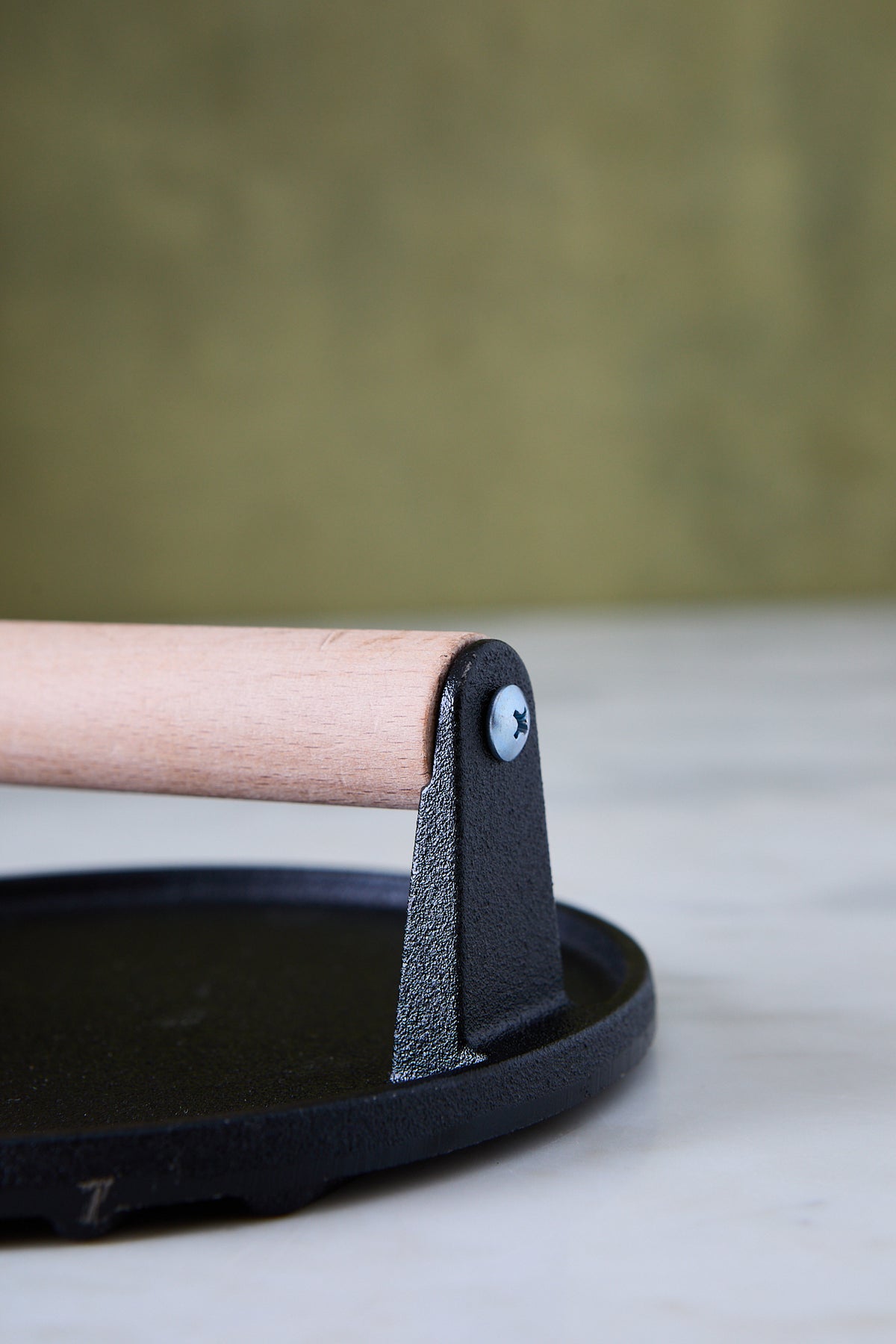 El prensador de carne de hierro fundido negro con manija de madera es el aliado ideal para lograr hamburguesas, bifes y sandwiches bien dorados y parejos. Su peso y material ayudan a sellar mejor la carne, reducir el tiempo de cocción y conseguir esa textura crocante que tanto gusta.