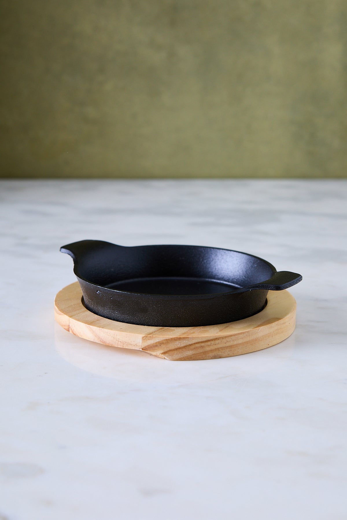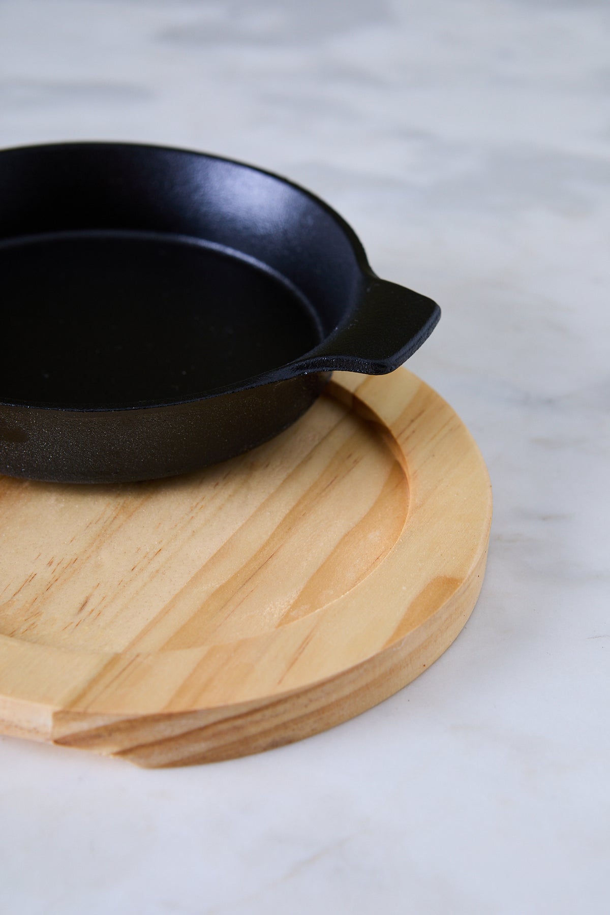 El plato redondo con manijas de hierro fundido negro y bandeja de madera es perfecto para servir porciones individuales, dips calientes, provoletas, salsas o pequeñas guarniciones. El hierro conserva mejor la temperatura, mientras la base de madera protege la mesa y suma un toque natural muy acogedor.