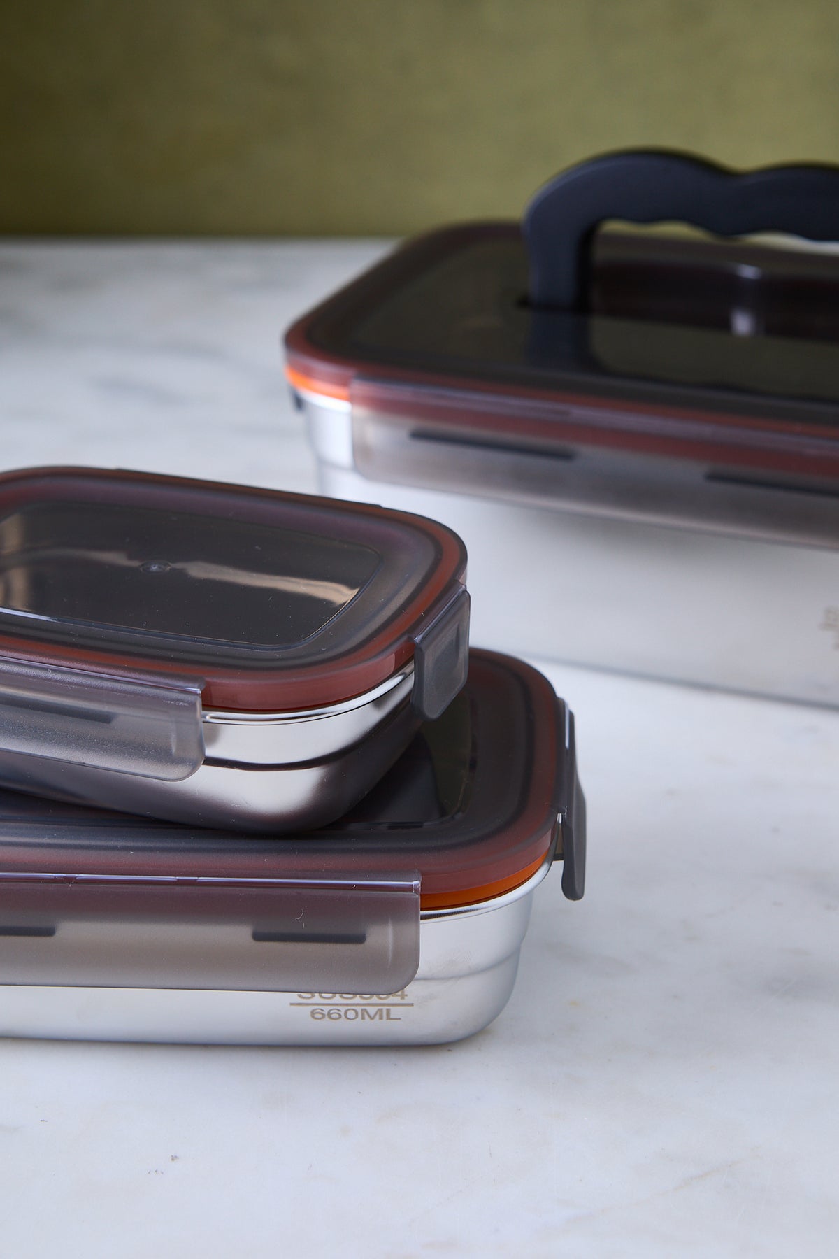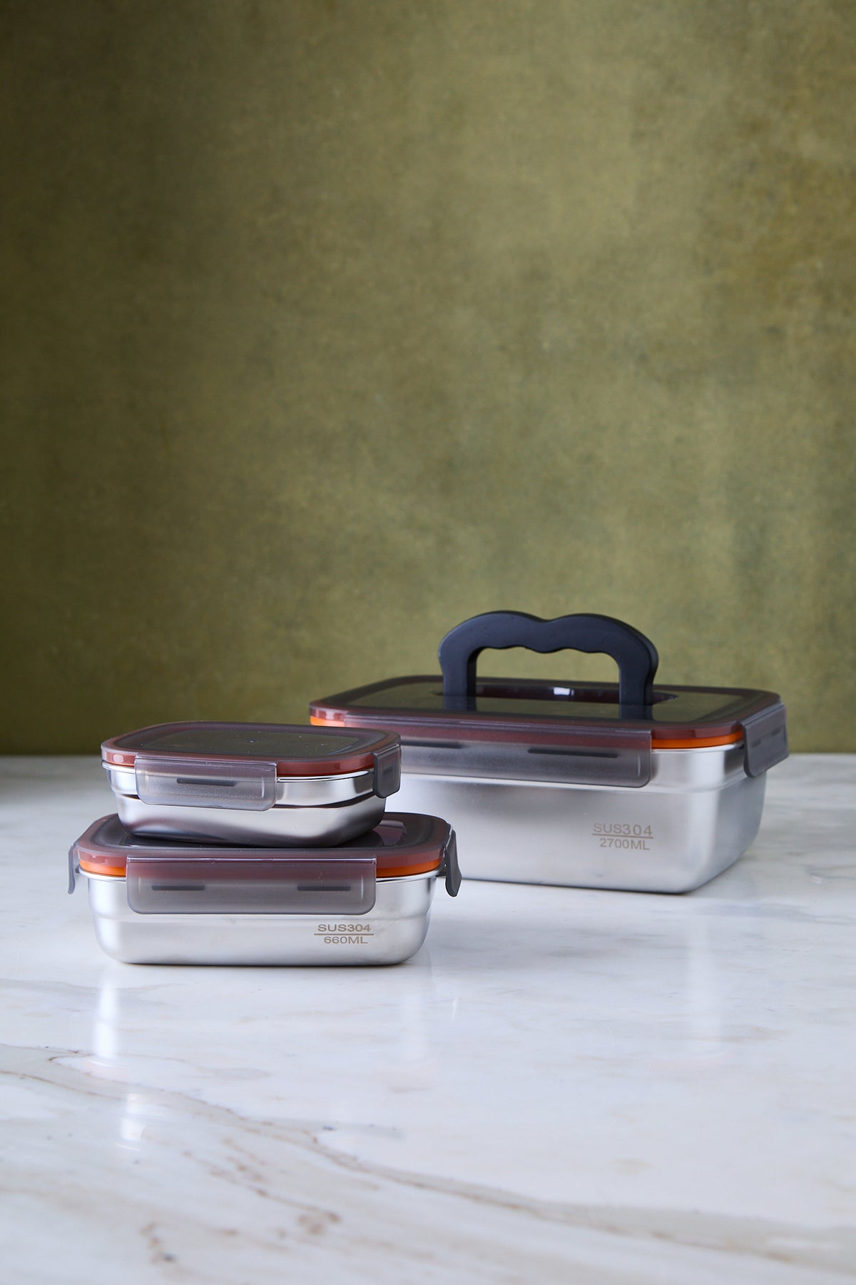 Este set de 3 contenedores de alimentos de acero es ideal para organizar la heladera y la alacena con estilo. Incluye tres capacidades (360 ml, 660 ml y 2700 ml) para guardar desde sobras de comida hasta preparaciones grandes, y uno de ellos trae manija para transportar con mayor comodidad.