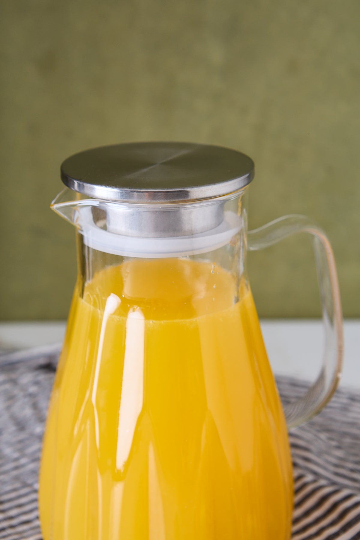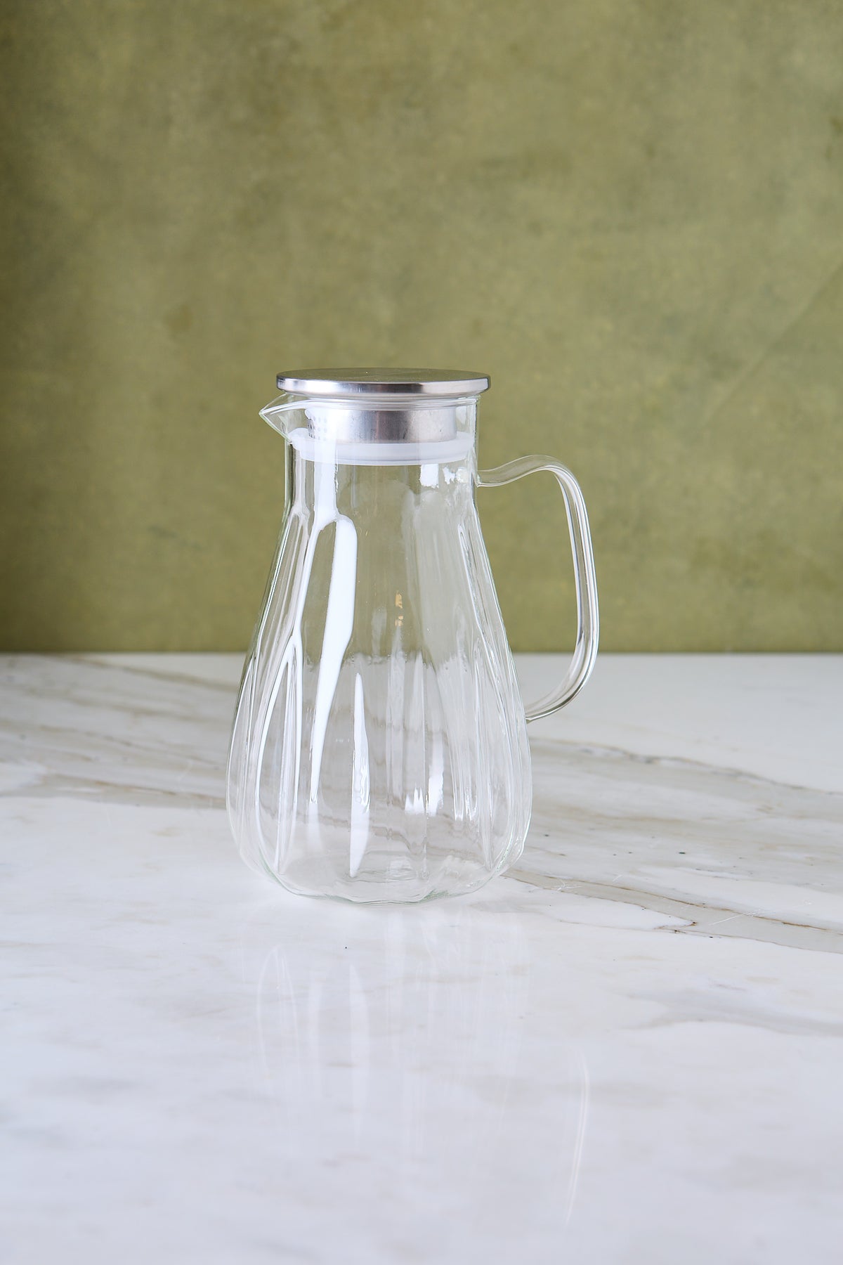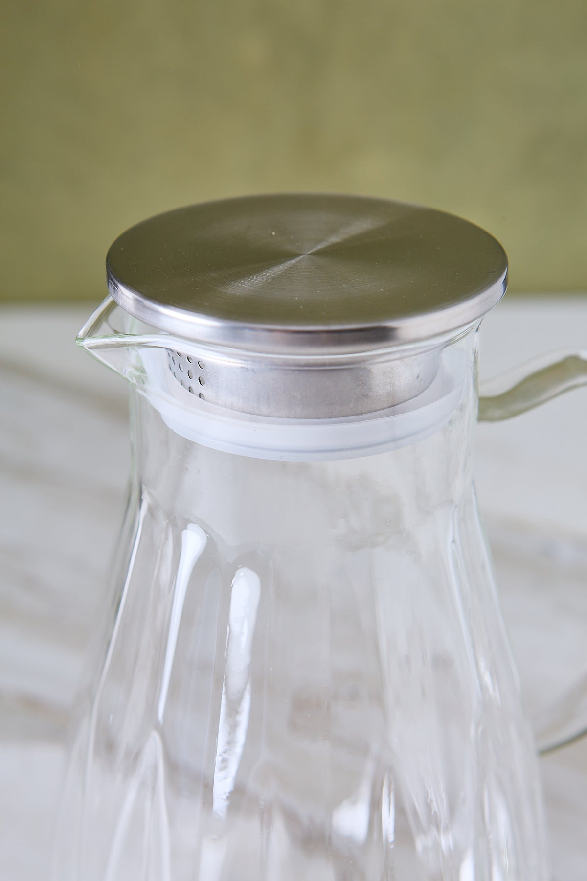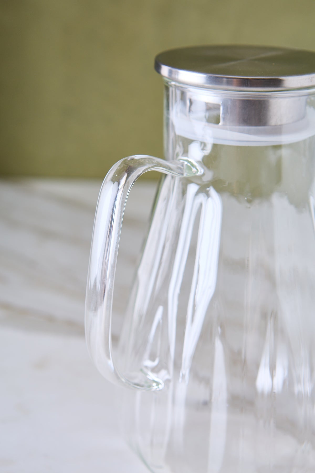Jarra de vidrio borosilicato con diseño cónico y tapa de acero inoxidable. Capacidad 1.8 litros. Ideal para agua, jugos o infusiones. Su tapa hermética con pico vertedor asegura practicidad y frescura. Estética limpia y duradera para el día a día.