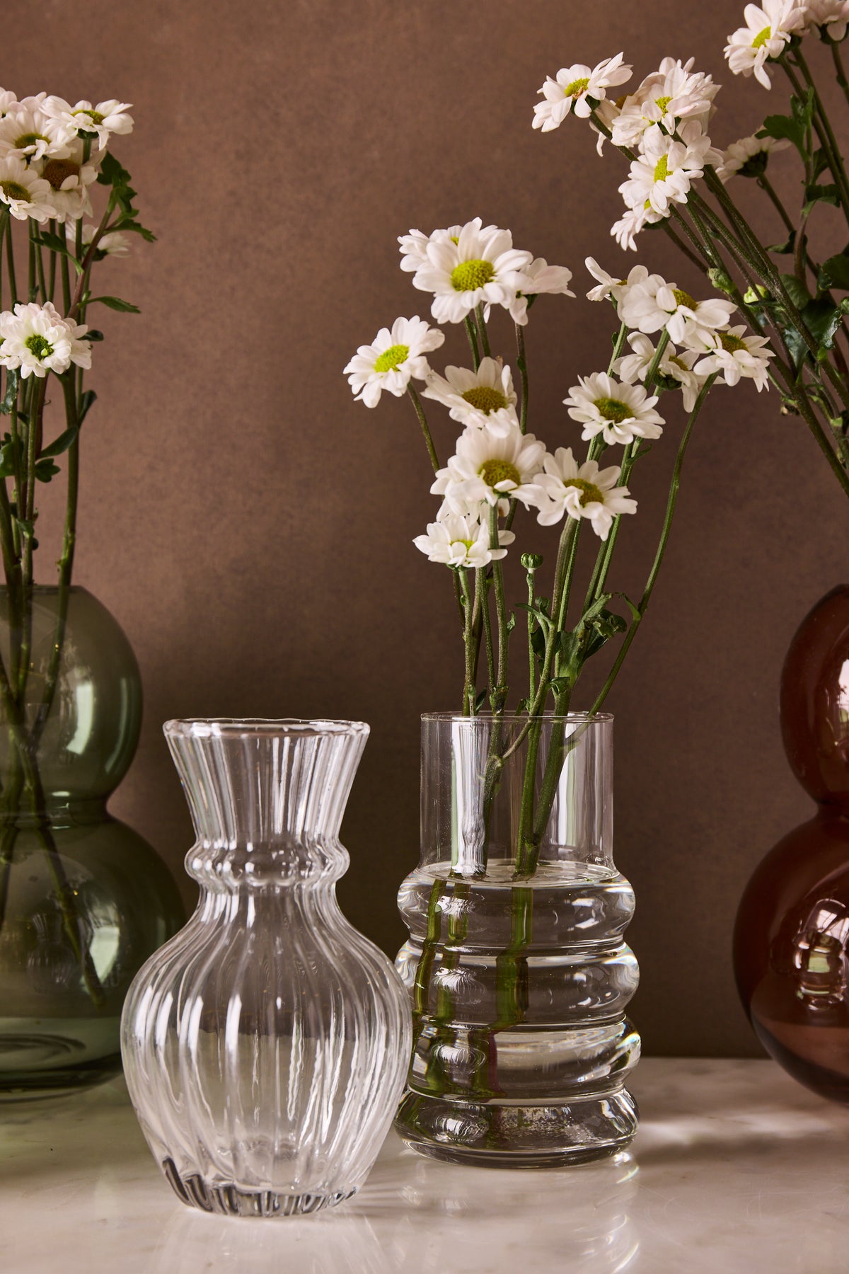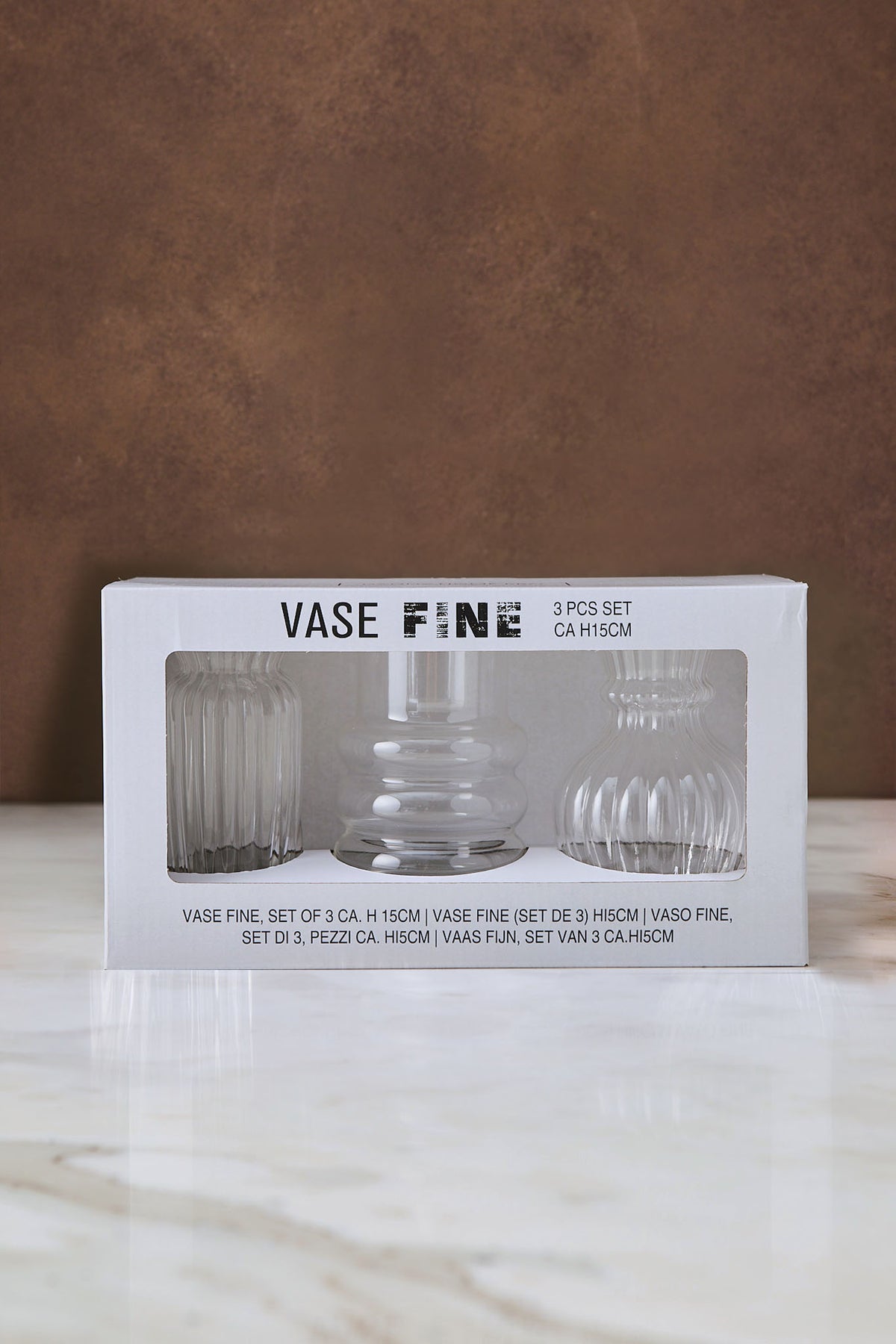 Set de 3 floreros Fine Clear, perfectos para combinar juntos o usar por separado. Su diseño estilizado y en vidrio transparente los hace versátiles para arreglos florales pequeños, flores individuales o como detalles decorativos minimalistas.