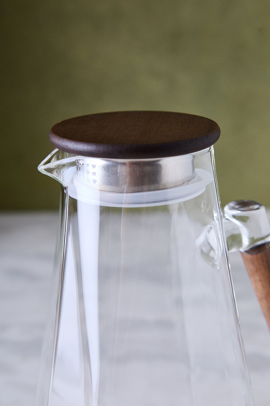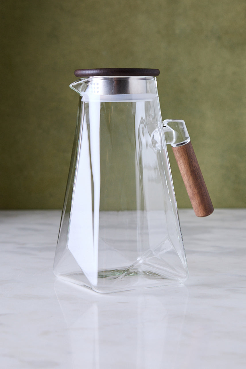 Versión más estilizada con asa de madera, pensada para quienes prefieren una jarra alta y esbelta que ocupe poco espacio en la mesa. El vidrio cristalino deja ver el color de las bebidas y la tapa de acacia ayuda a conservar mejor el sabor, ideal para té frío, aguas saborizadas o jugos caseros.