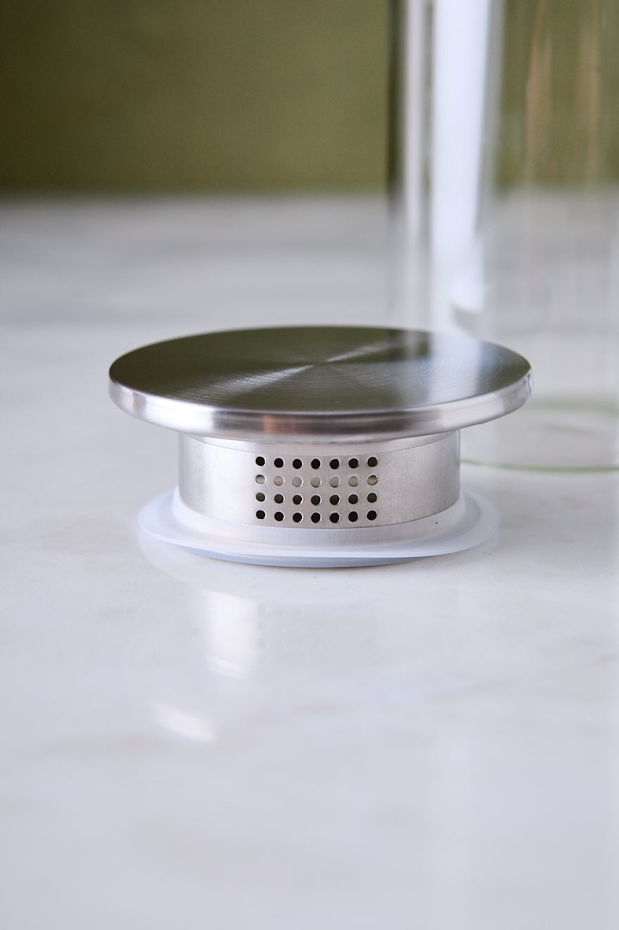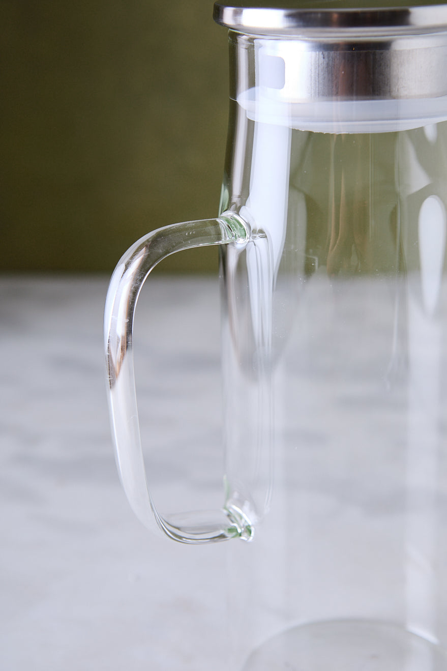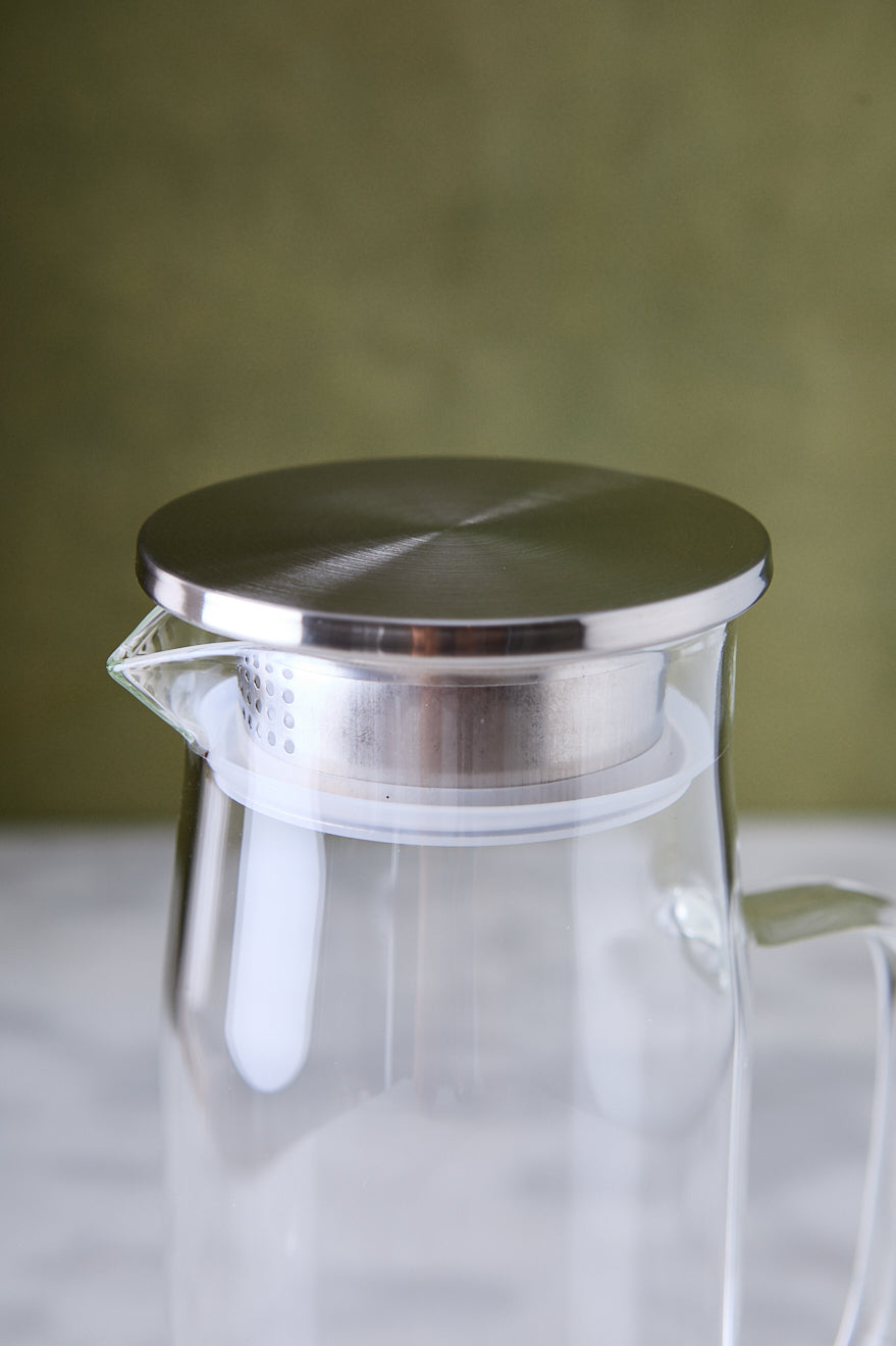 La opción redonda de esta línea de jarras es ideal para porciones medianas, perfecta para desayunos, meriendas o brunch en familia. El cuerpo de vidrio transparente permite ver el contenido y la tapa en acero ayuda a proteger las bebidas dentro y fuera de la heladera.