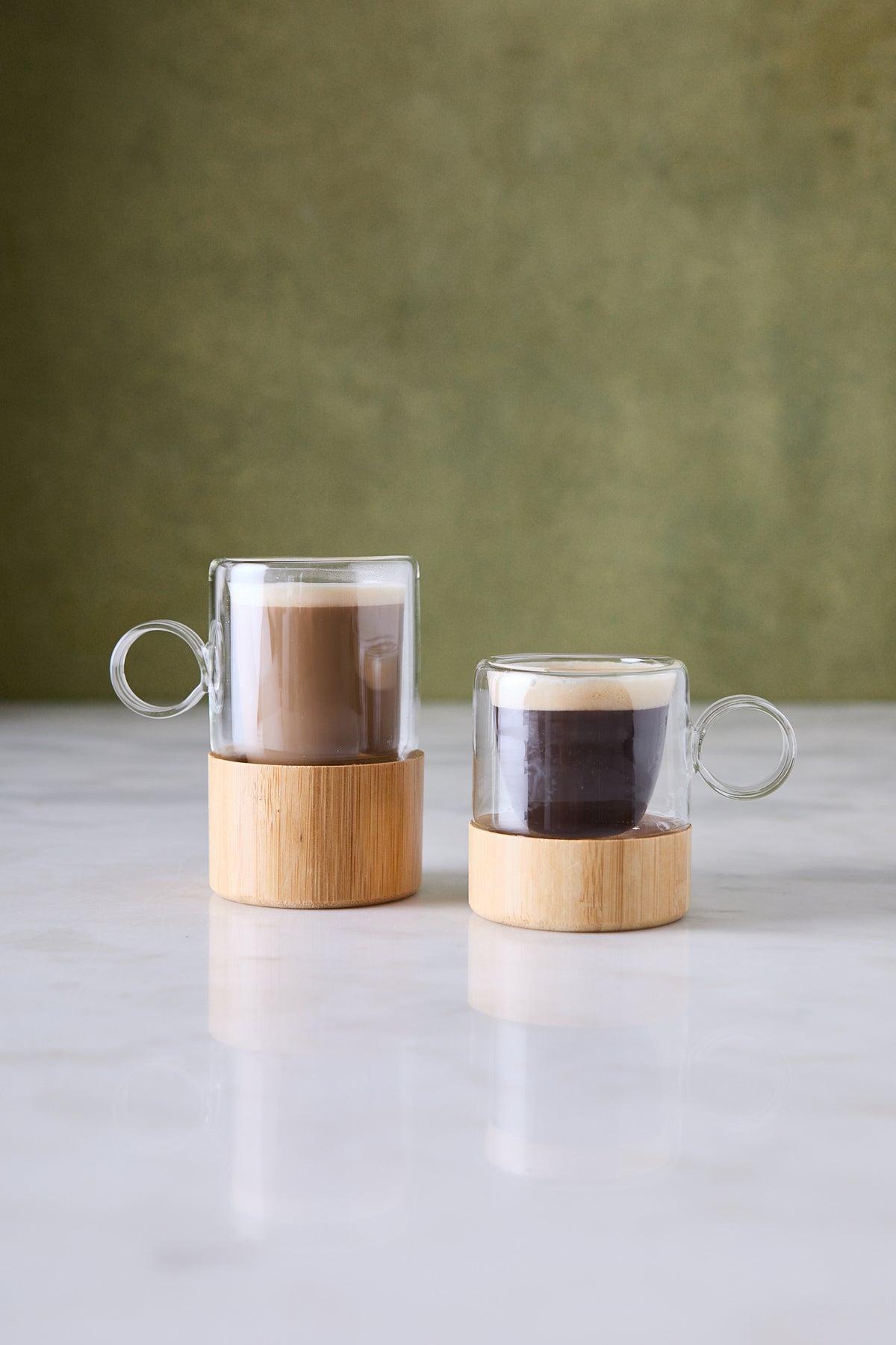 El pocillo térmico de doble pared con base de bambú es perfecto para servir espresso largo, macchiato o pequeños cafés especiales. El doble vidrio mantiene la temperatura por más tiempo sin calentar la mano, mientras la base de bambú aporta calidez y estabilidad.