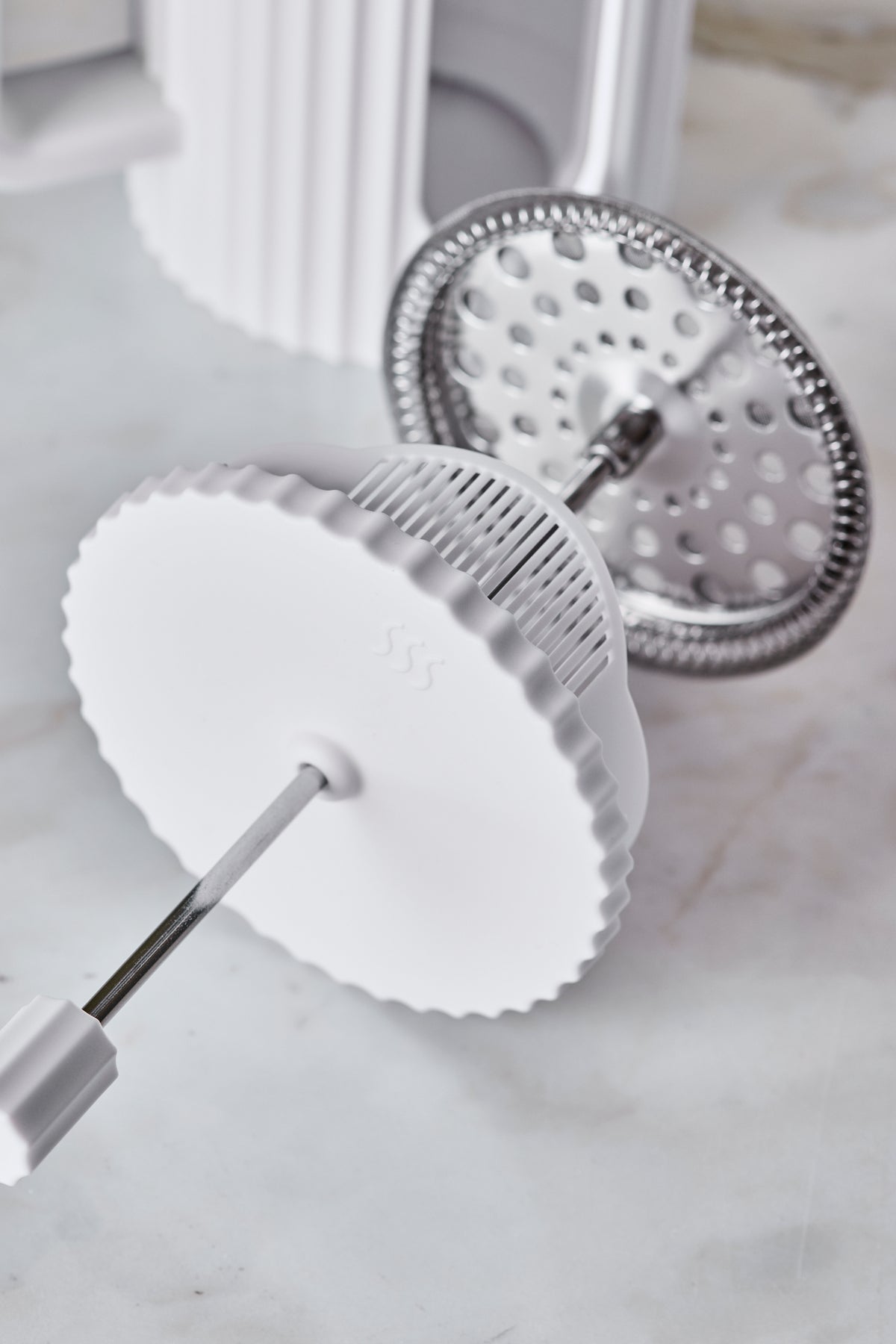 Sistema de émbolo con filtro metálico reutilizable y asa ergonómica para un agarre seguro.