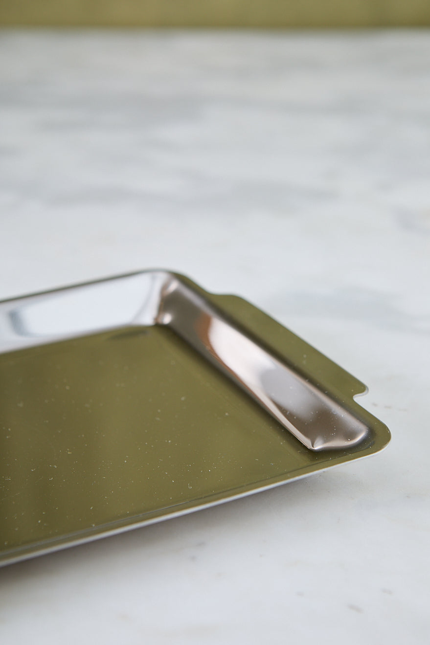 La bandeja rectangular de acero espejado es perfecta para espacios más chicos: baños, mesitas auxiliares o la entrada de casa. Su tamaño permite apoyar llaves, perfumes, cremas o pequeños adornos, manteniendo todo ordenado y con un look sofisticado.