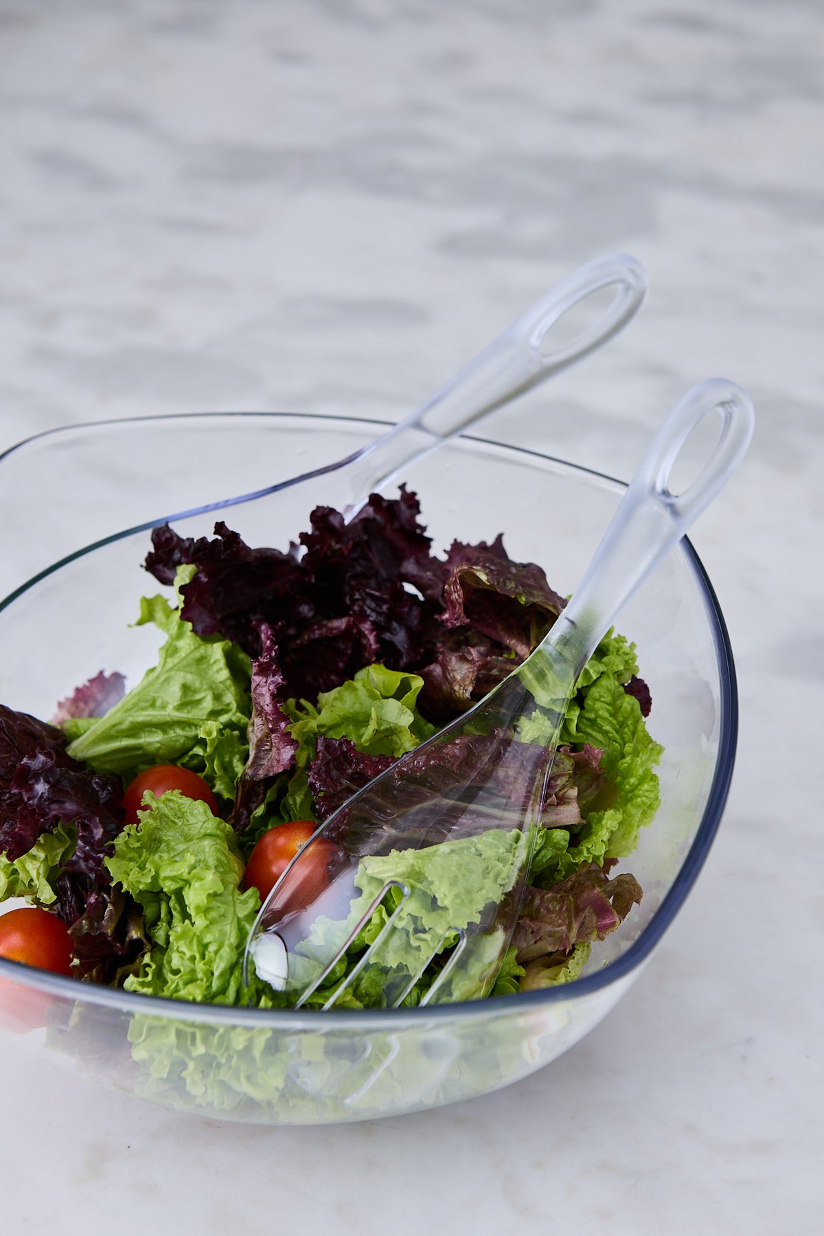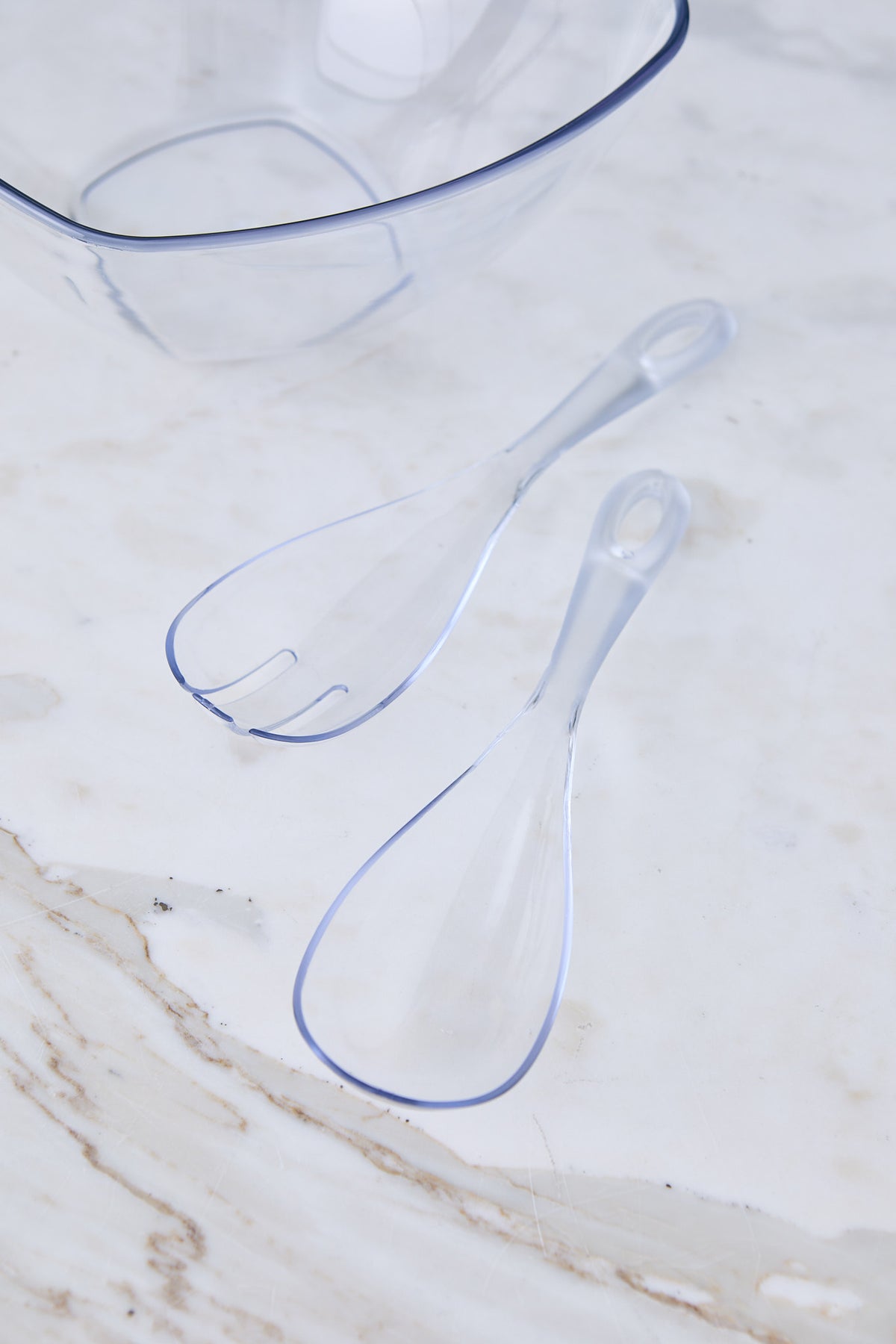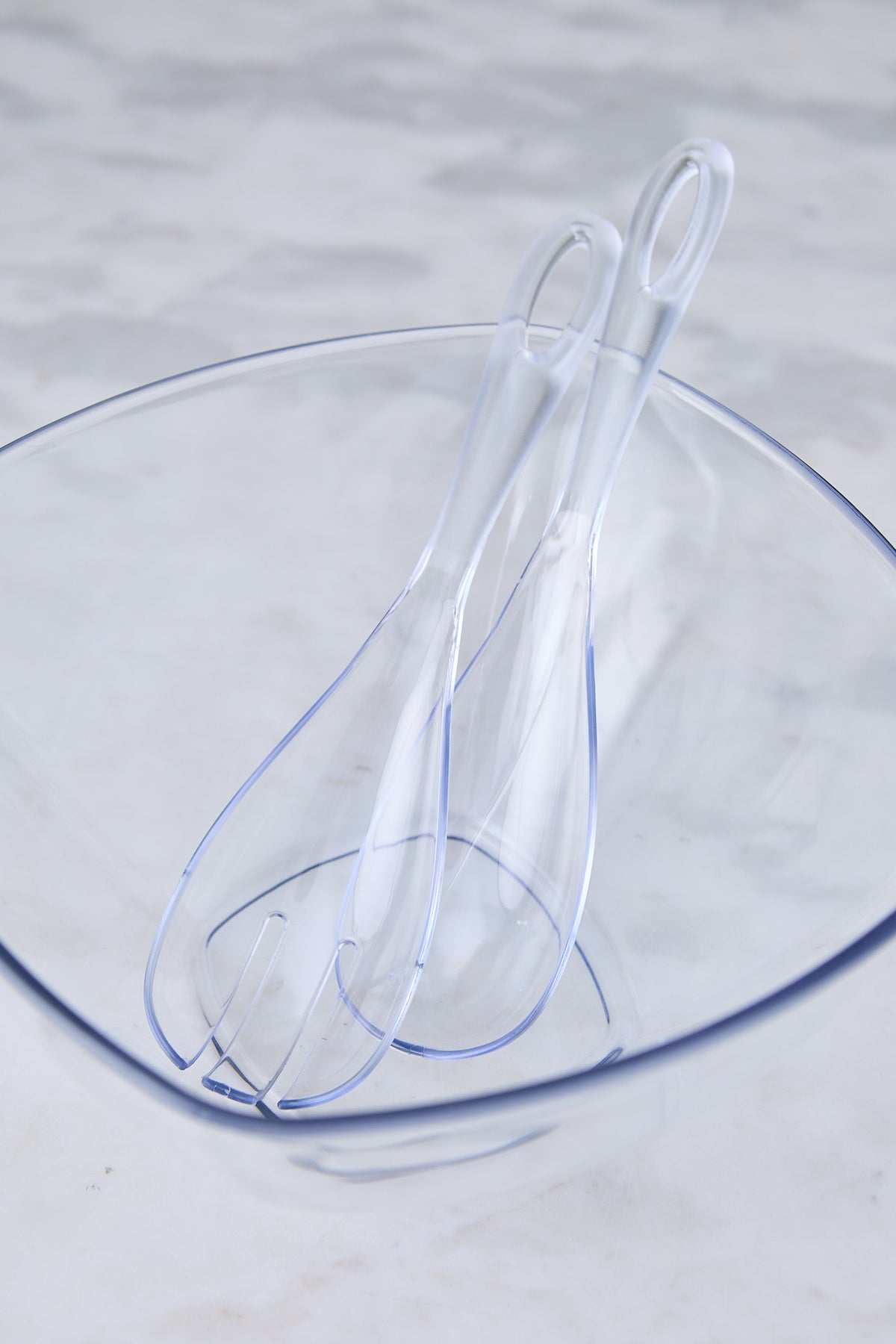Practicidad y diseño en un solo set. La ensaladera Square de acrílico transparente incluye cubiertos a juego, ofreciendo resistencia y estilo para servir tus preparaciones.