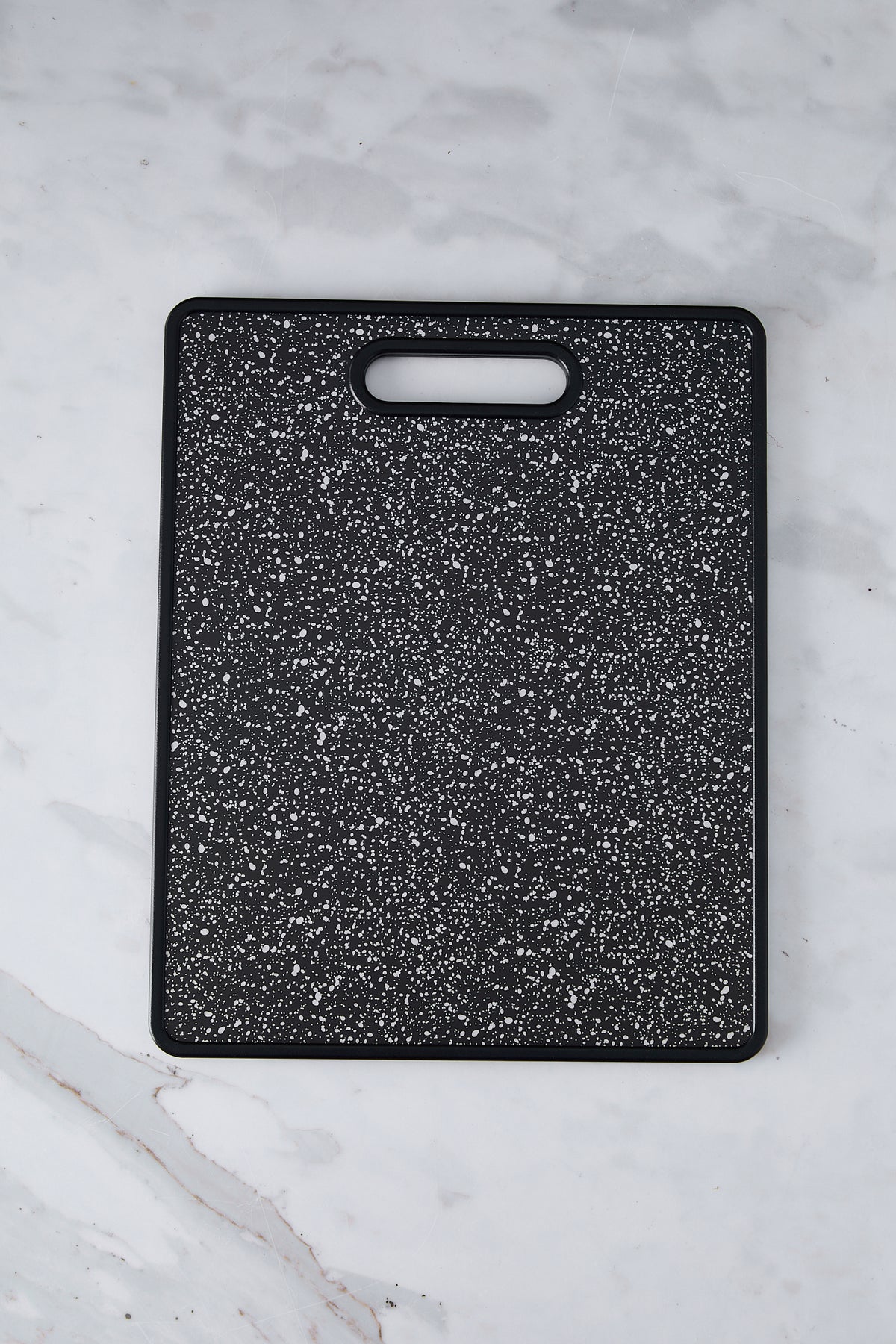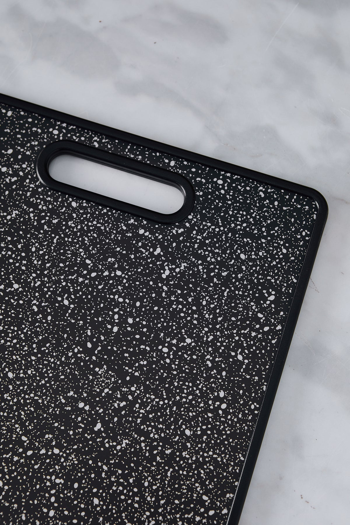 Amplia tabla estilo granito negra de 38 cm. Su superficie resistente y lisa es ideal para trabajos de corte exigentes, mientras que su estética elegante la hace perfecta para llevar directamente a la mesa como base de presentación. Una pieza que une practicidad, higiene y estilo en la cocina.