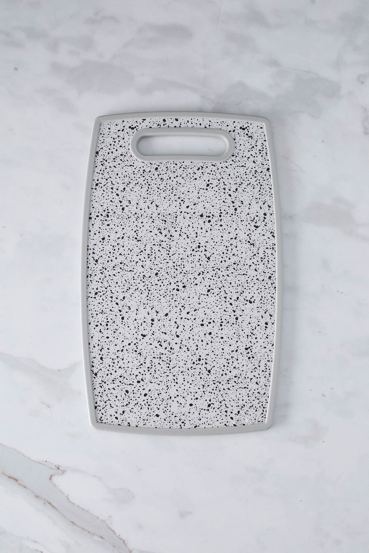 Tabla estilo granito blanco de 37 cm de diámetro. Diseñada para soportar el uso constante en la cocina, ofrece una superficie firme y elegante para cortar carnes, verduras o pan. Su color claro y textura natural aportan luminosidad y estilo, siendo también perfecta para servir aperitivos directamente en la mesa.