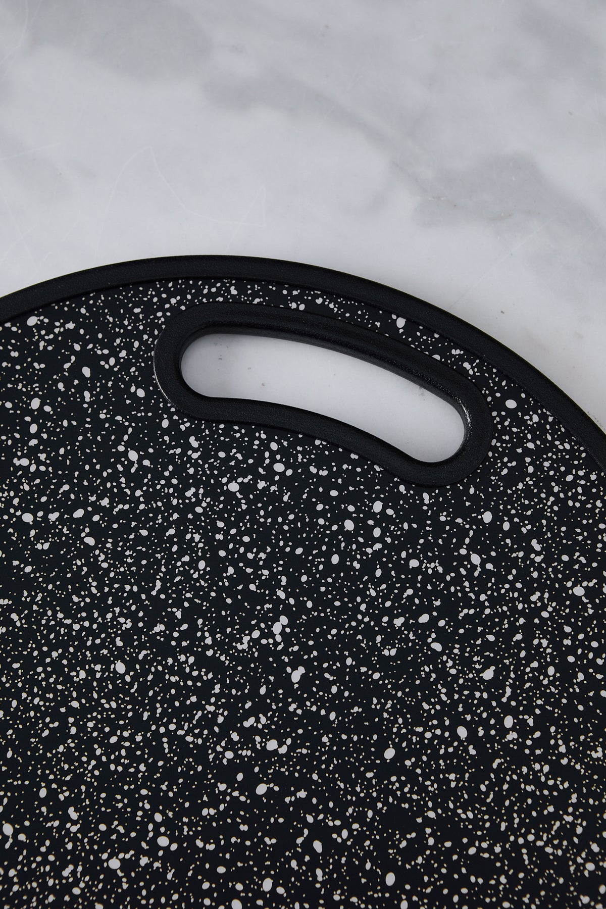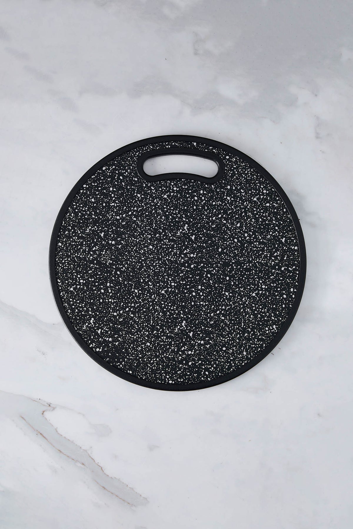 Tabla redonda estilo granito negro de 35 cm de diámetro, perfecta para quienes valoran la estética y la durabilidad. Su superficie sólida y resistente permite preparar alimentos con comodidad y seguridad, mientras que su diseño sobrio y elegante la hace ideal también como bandeja de presentación para quesos, fiambres o postres. Un complemento versátil para uso diario y ocasiones especiales.