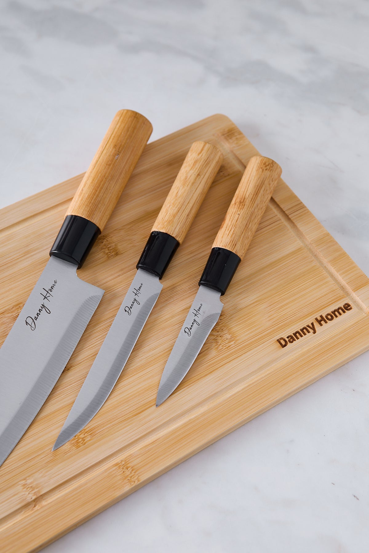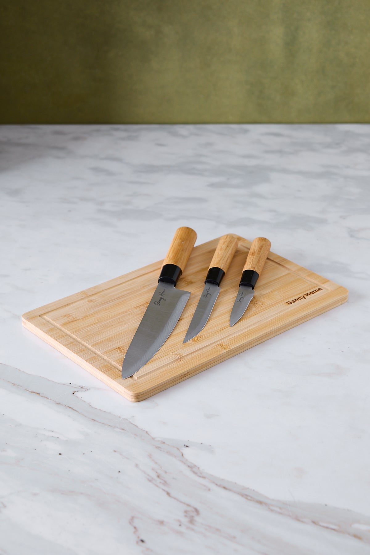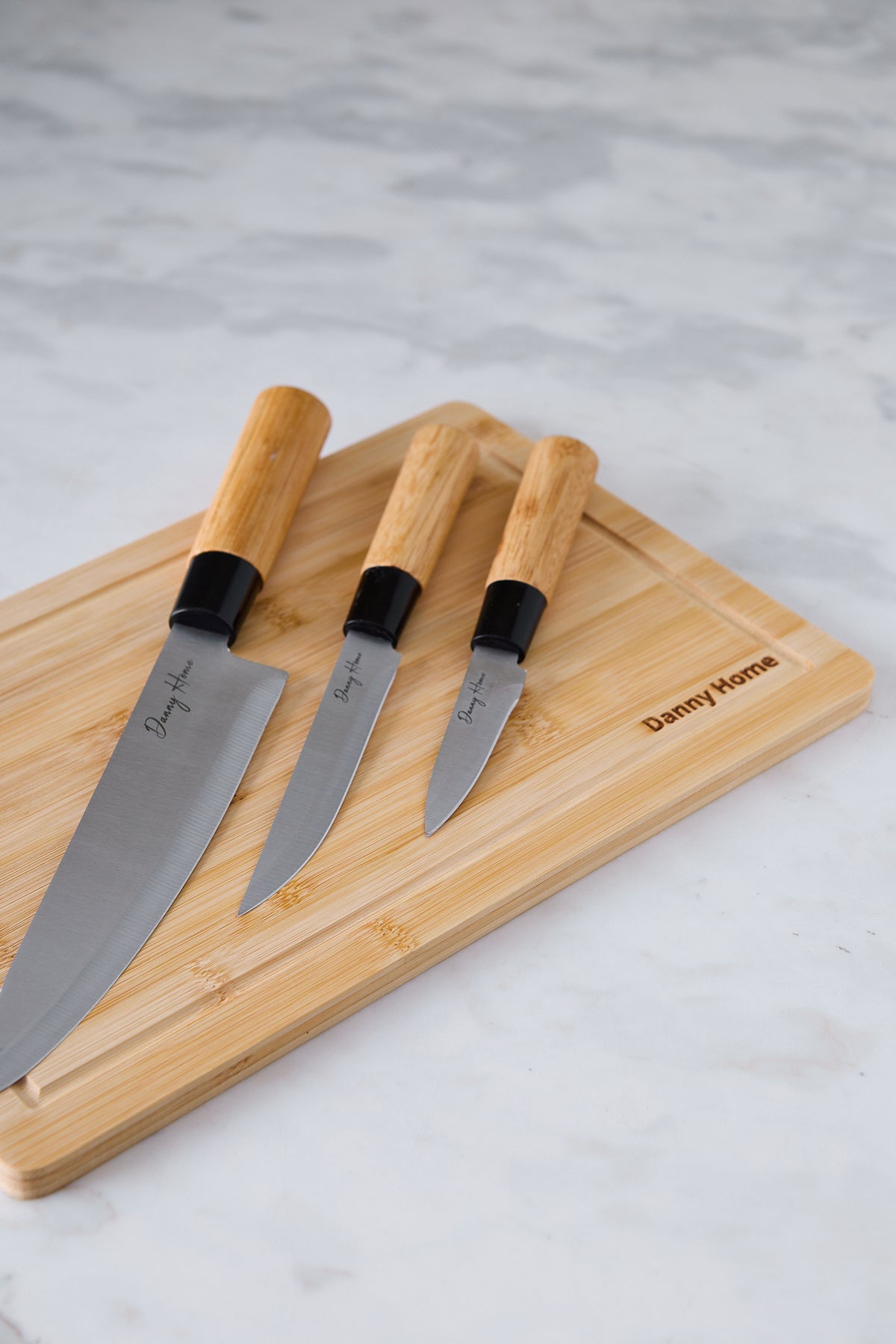 Un set práctico y elegante que reúne tabla de bambú y tres cuchillos de acero inoxidable, ideal para preparar y presentar alimentos.