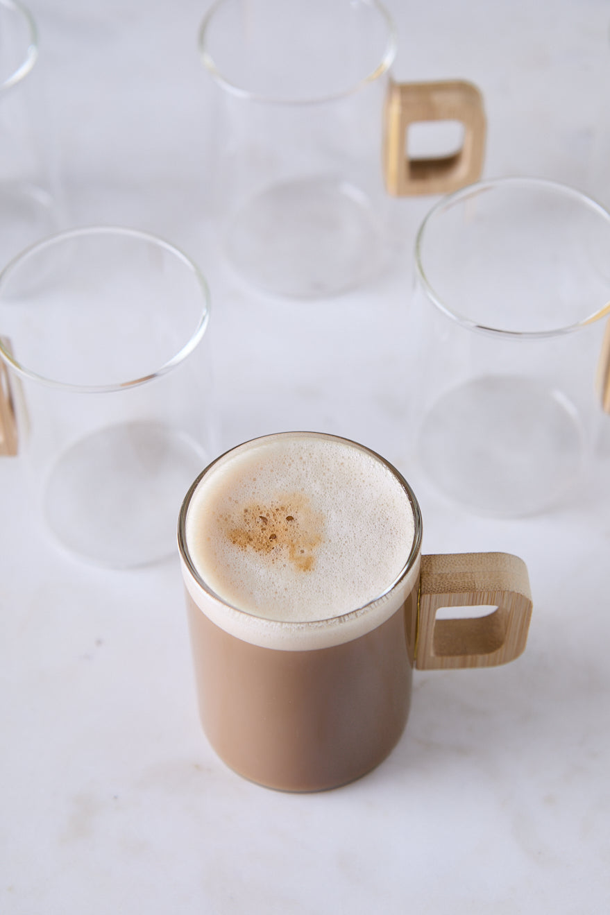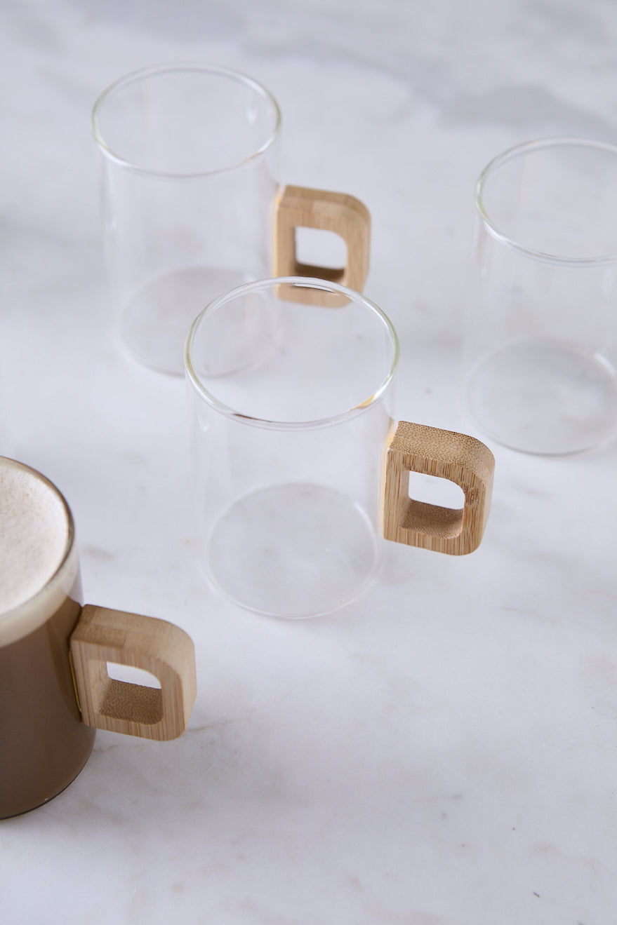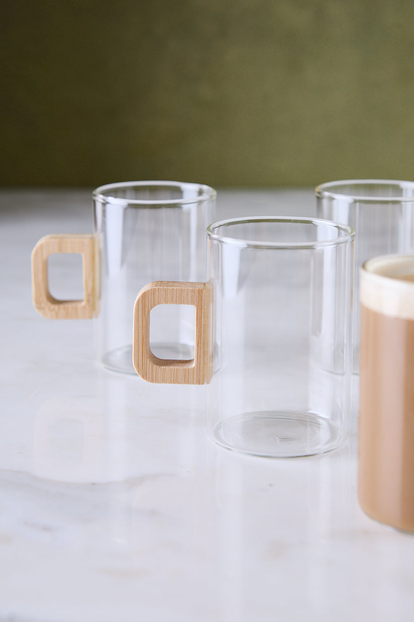 El set de 6 pocillos de vidrio con manija de bambú en formato alto es ideal para capuccinos, té o cafés con leche en desayunos y meriendas. El contraste entre vidrio transparente y madera crea una estética cálida, fácil de integrar a vajilla blanca, platos de bambú o individuales de mesa.