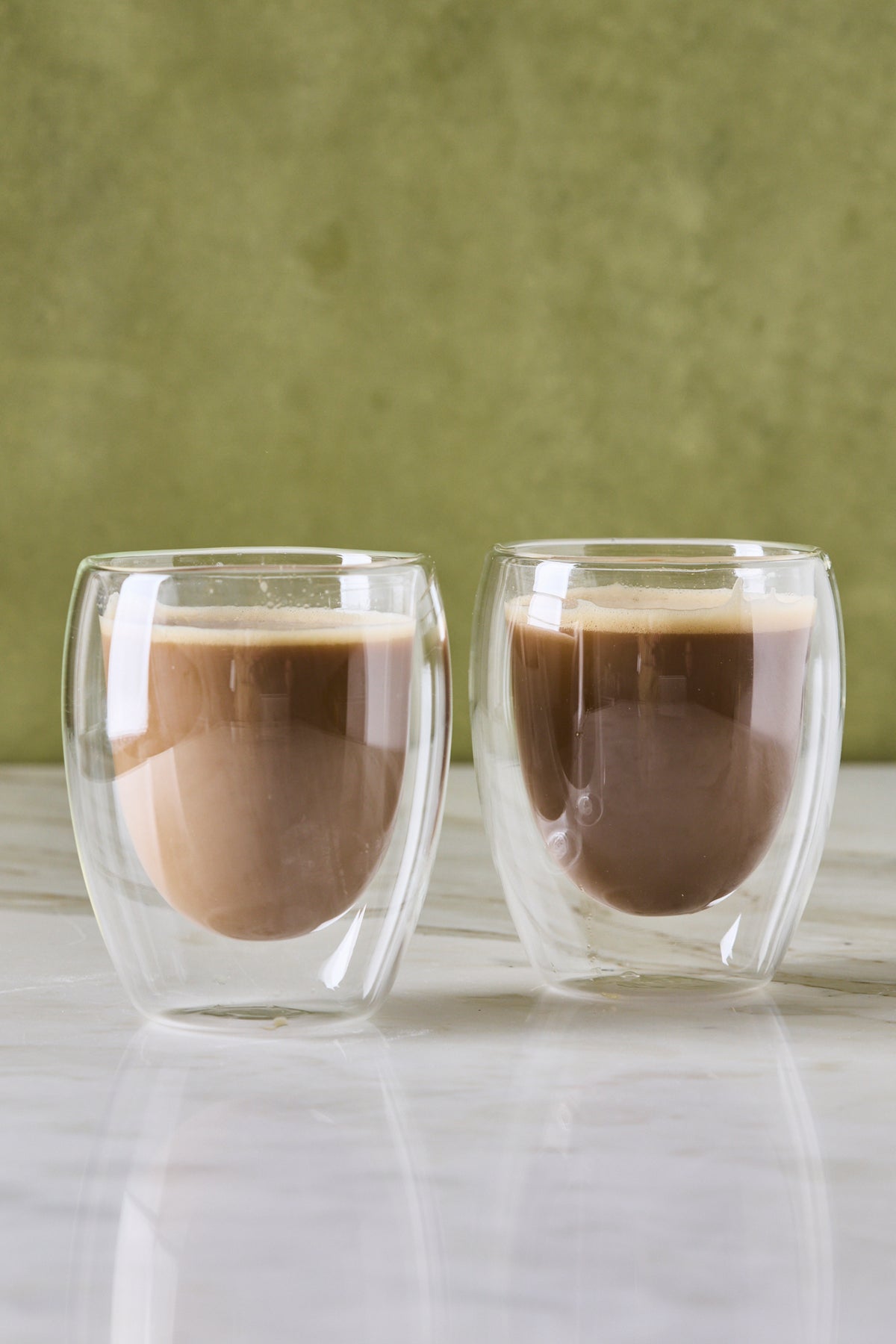 Set de 2 vasos de doble vidrio de 300 ml, perfectos para cappuccino, tés o bebidas frías. El diseño de doble pared conserva la temperatura y evita la condensación externa.