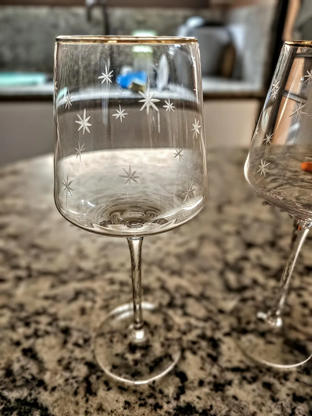El set de copas de vidrio con borde dorado y grabado de estrellas combina elegancia y un toque artesanal único. Su diseño transparente con relieves estrellados aporta brillo y textura, convirtiéndolas en un verdadero objeto decorativo para la mesa.