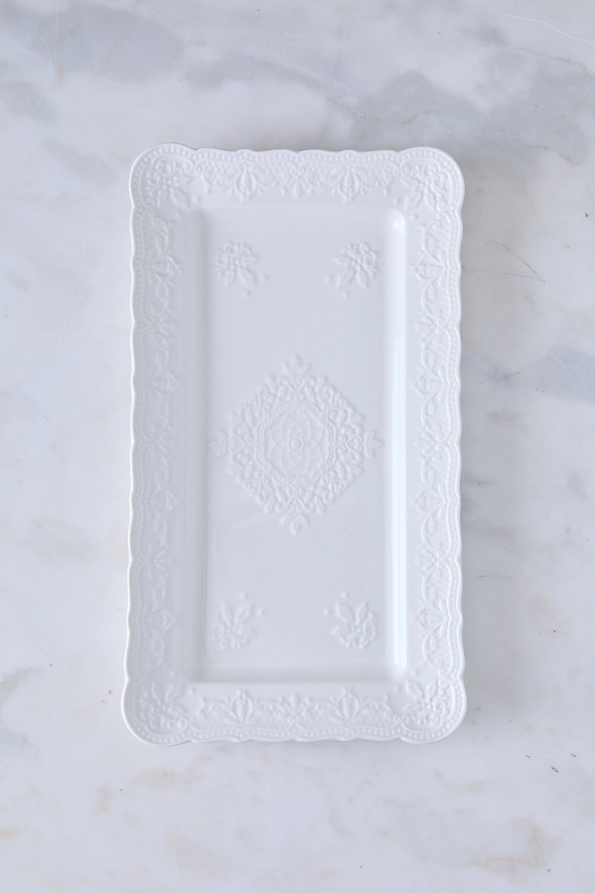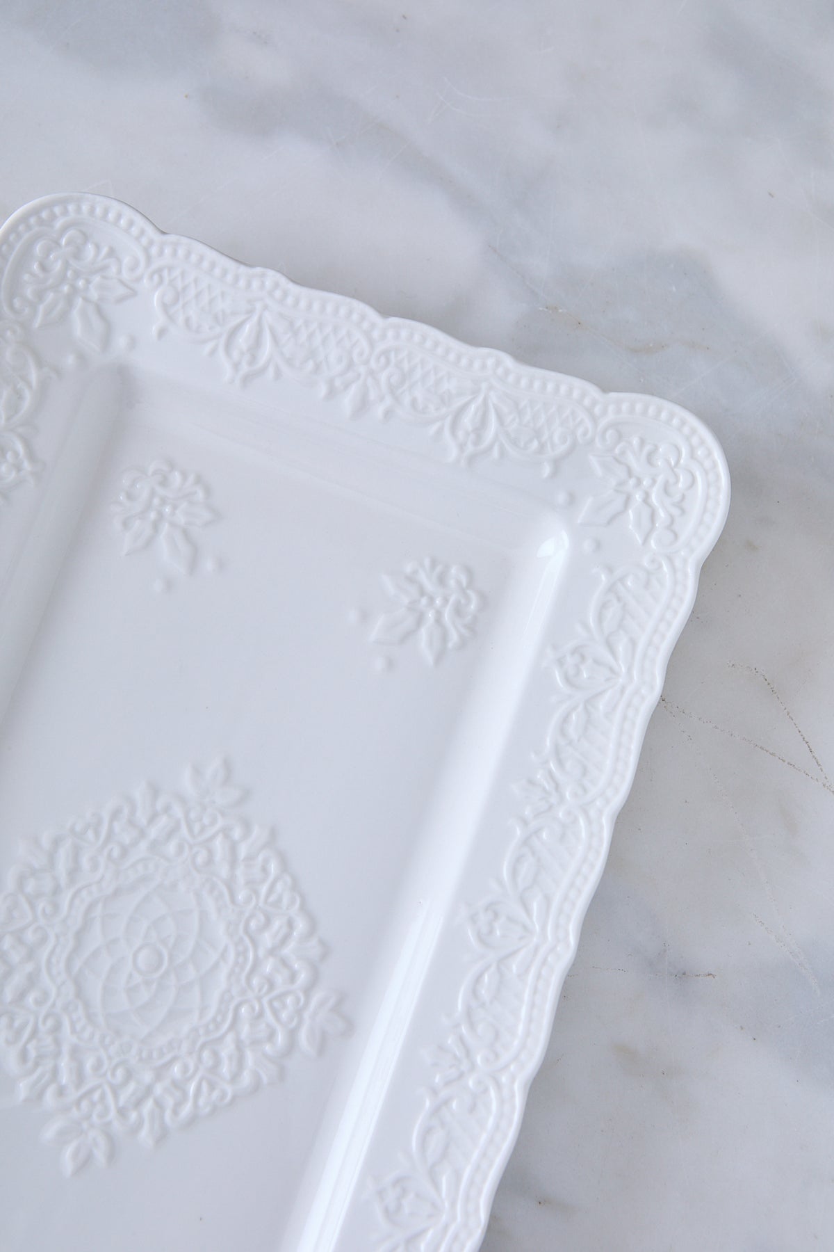 Esta bandeja aporta un toque delicado y elegante a tu mesa. Su diseño tipo bordado en relieve y el color blanco puro la hacen perfecta para presentar entradas, quesos, panes o postres, creando una puesta de mesa prolija y luminosa.
