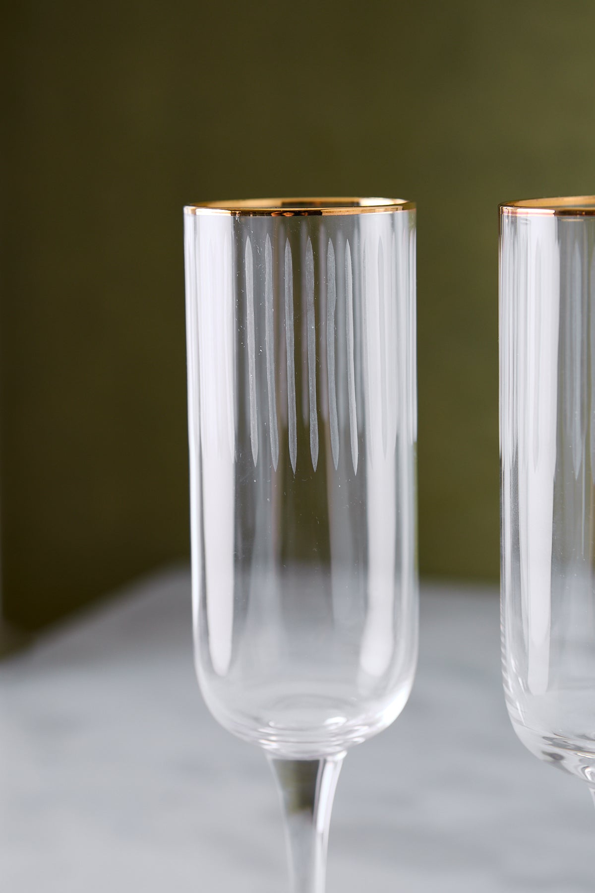 El set de copas altas con borde dorado es ideal para quienes buscan un toque refinado sin perder simplicidad. Su silueta esbelta realza el espumante o champagne, mientras el acabado metálico superior eleva su presentación.