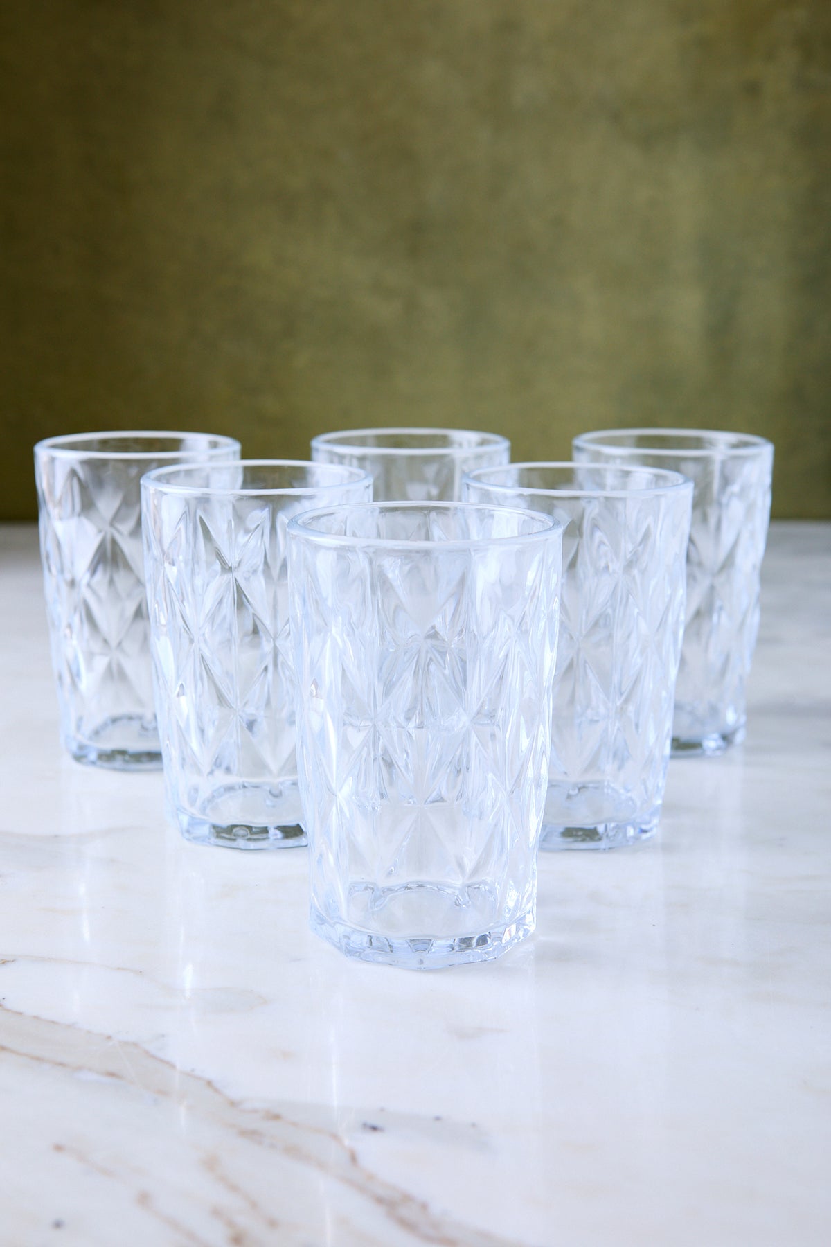El juego de 6 vasos altos Diamante presenta un diseño clásico con un elegante patrón tramado en rombos. Perfecto para servir tus bebidas favoritas en cualquier ocasión, añadiendo un toque de sofisticación a tu mesa.